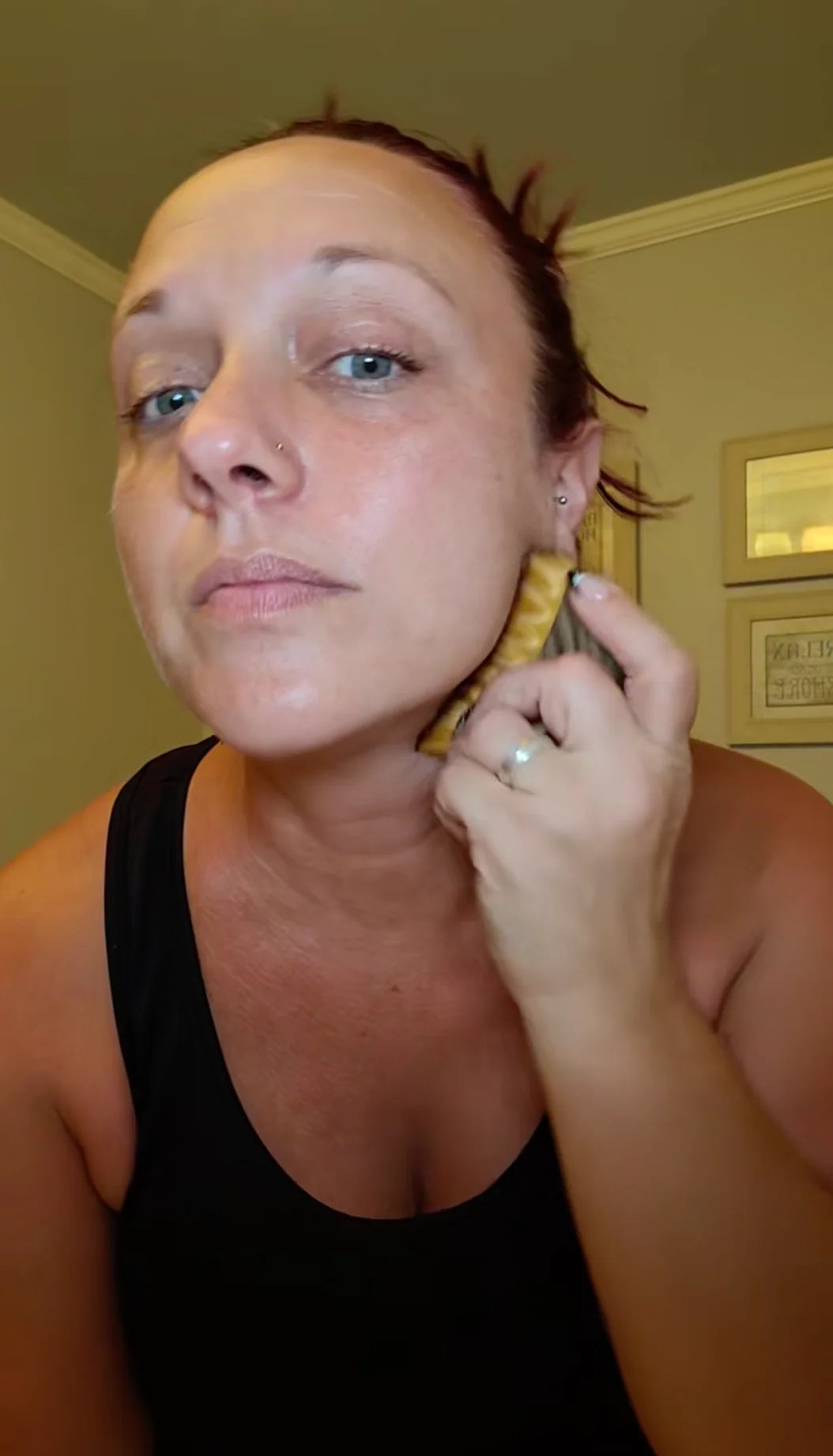 ✓ 90 seconds, neck → jaw → cheeks → under-eyes → forehead